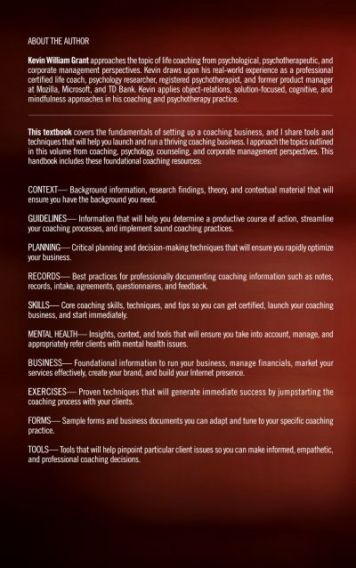 This textbook covers the fundamentals of setting up a coaching business. I share tools and techniques that will assist you in launching and running your thriving coaching business. I approach this topic from coaching, psychology, counseling, marketing, and corporate management perspectives. The following foundational coaching resources are covered in this handbook: